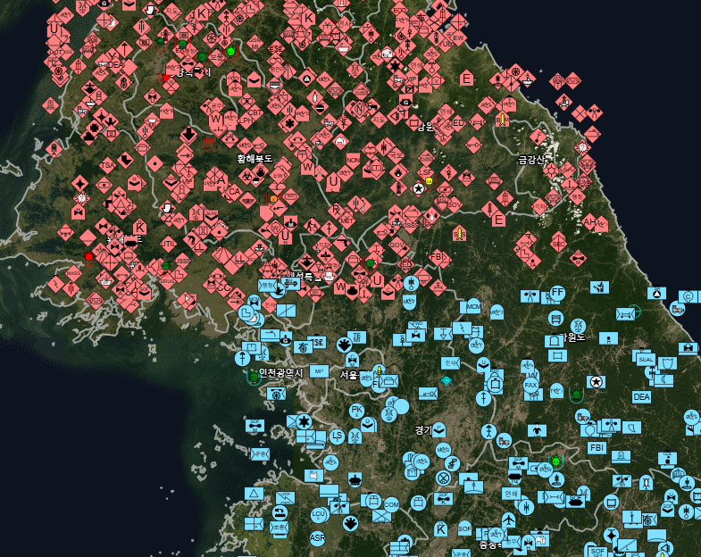 - 다수의 피아 표적에 대한 감시/정찰 상황도를 시뮬레이션했습니다. 많은 수의 표적을 지도 상에 배치하여도 성능 저하없이 상황도를 구성할 수 있습니다. 단순히 표적만 지도 상에 표시하는 것이 아니라 표적의 상세 정보(표적 명, 군대부호)를 함께 표시할 수 있습니다.